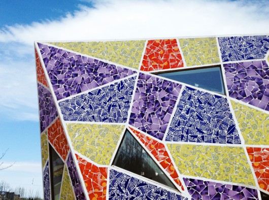 Dinding luar ditempel pecahan dari guci keramik yang disusun dengan warna artistik dan dilengkapi dinding kaca yang tersamar untuk pencahayaan.